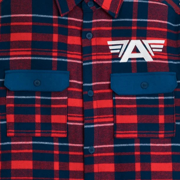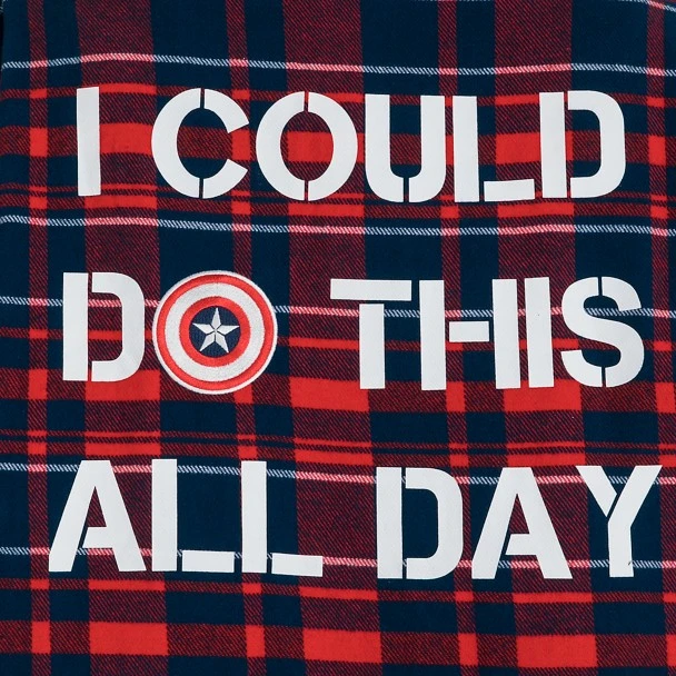 This shacket features the immodest Captain America boast about his tireless stamina when it comes to performing heroics. ”I could do this all day,” is emblazoned across the back of this plaid shirt/jacket, while Cap’s winged ”A” symbol is featured above the flap chest pocket.