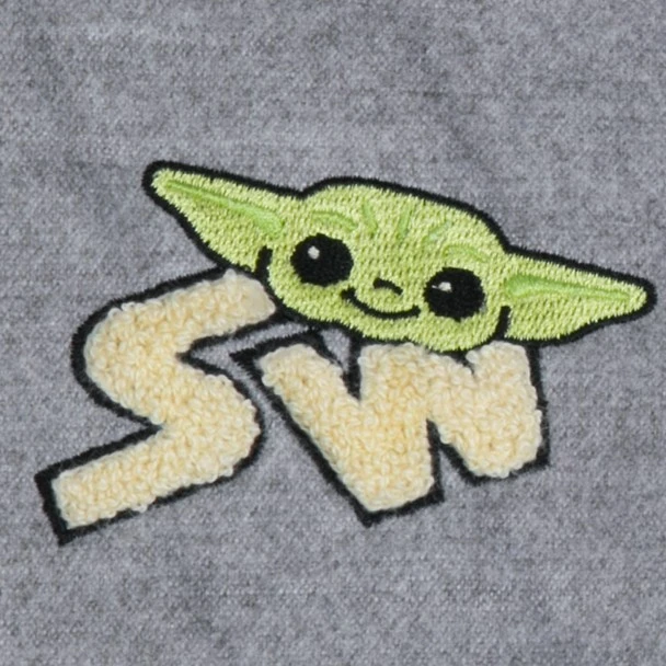 - Embroidered chenille Grogu appliquΓ©s on chest and back