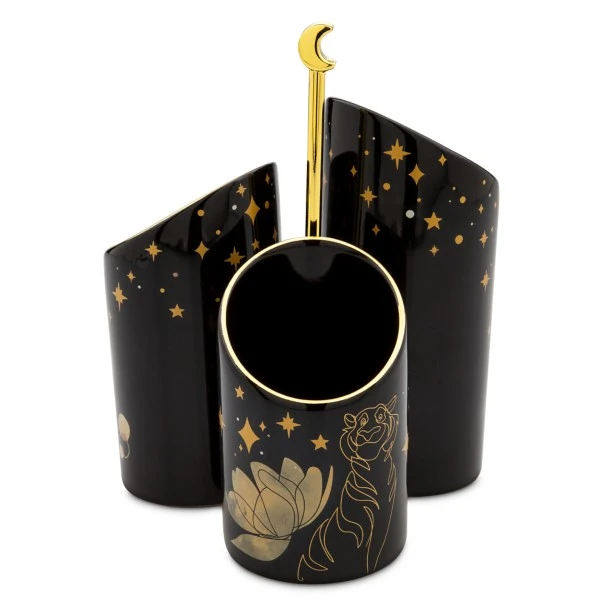 Take your beauty station to a whole new world with this Jasmine makeup brush holder. Inspired by Disney’s animated Aladdin, this holder contains three attached cups, goldtone rod with crescent moon topperΒ and stunning artwork of Jasmine.
