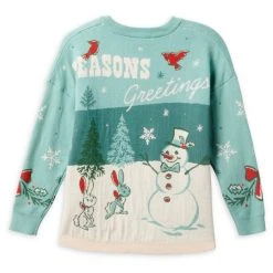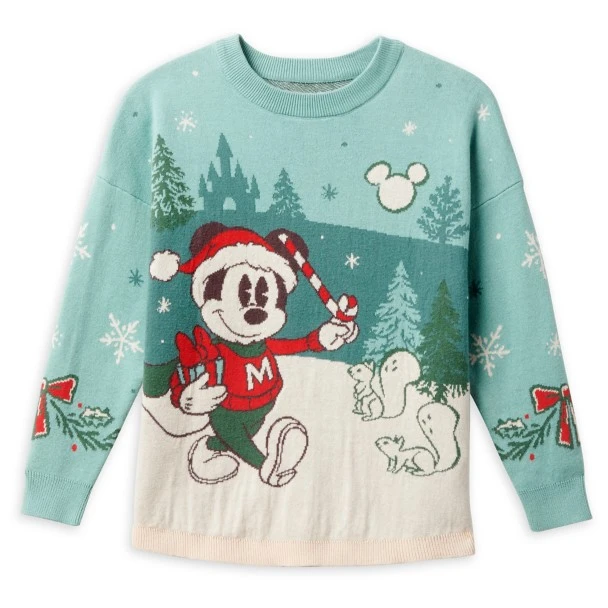 Mickey strolls through a holiday scene on this knit sweater with the famous Spirit Jersey cut. From the back shoulder, ”Season’s Greetings” are shared with one and all.