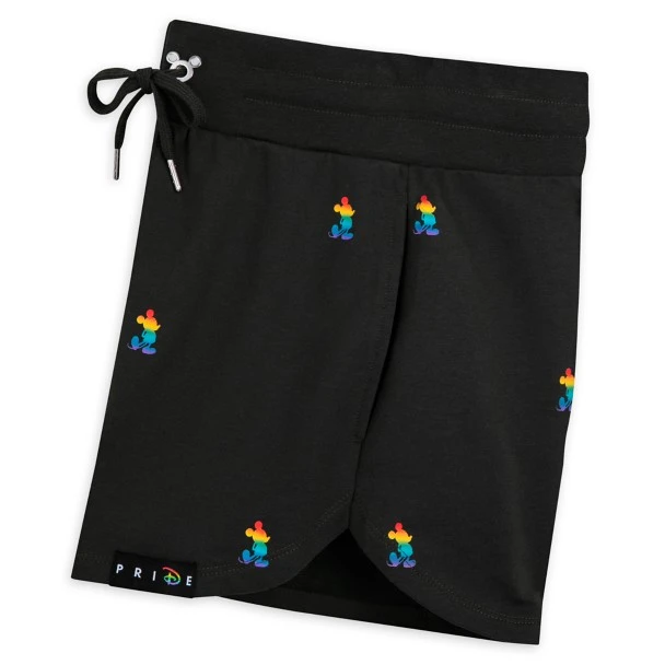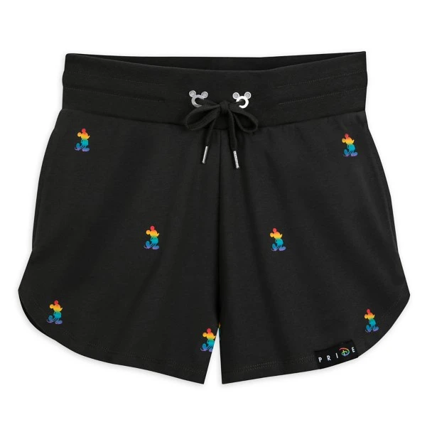 Mickey’s silhouette in rainbow colors is printed allover these retro-look shorts with wide elastic waistband and drawstring tie, plus Mickey icon grommets and a Disney Pride Collection label.