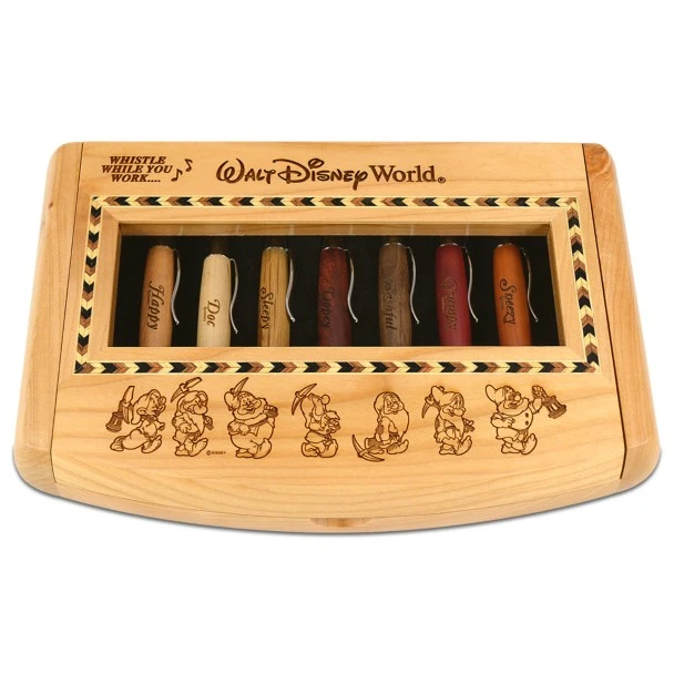 - Set includes seven pens and elegant wood display case with inlaid pattern and etched artwork of Dopey, Grumpy, Happy, Sneezy, Sleepy, Bashful and Doc, plus ”Whistle While You Work” and ”Walt Disney World”