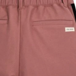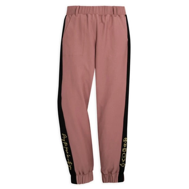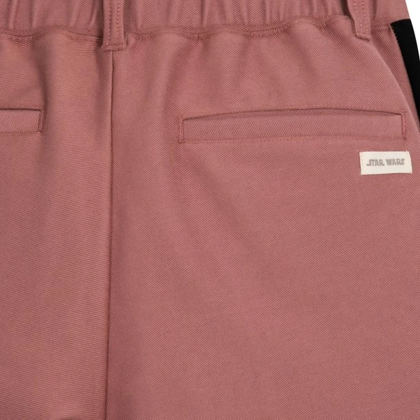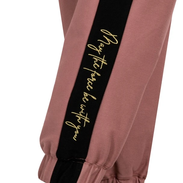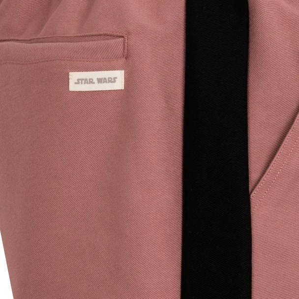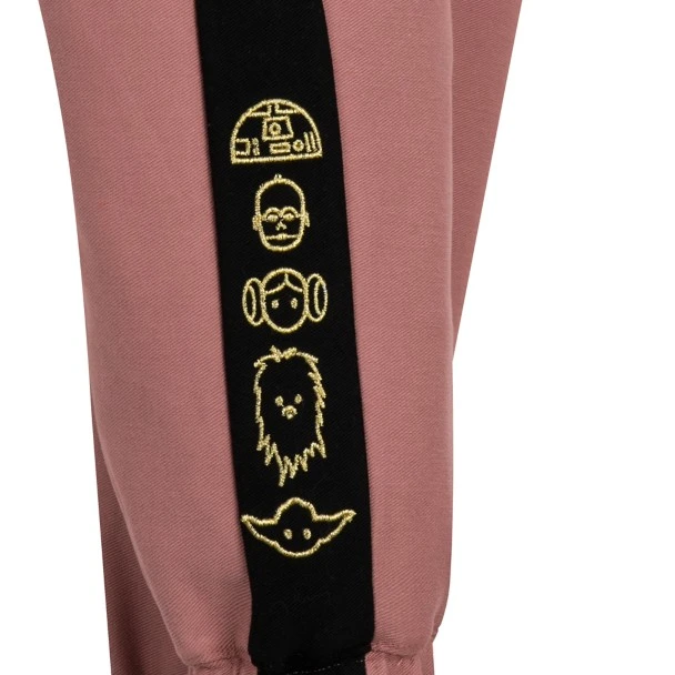Gold lurex embroidery outlines five favorite Star Wars characters down the side of the left leg of these knit twill pants while the movie’s iconic catchphrase, ”May the Force be with you,” is embroidered down the right leg. The contrasting stripe adds some stellar style.