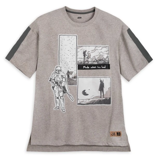 Pay homage to the series that introduced us to Din Djarin and Grogu with this cool Star Wars t-shirt. It features appliqués with artwork inspired by the Disney+ series, including the pivotal moment The Mandalorian meets baby Yoda which started their journey together.