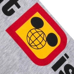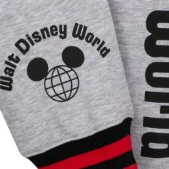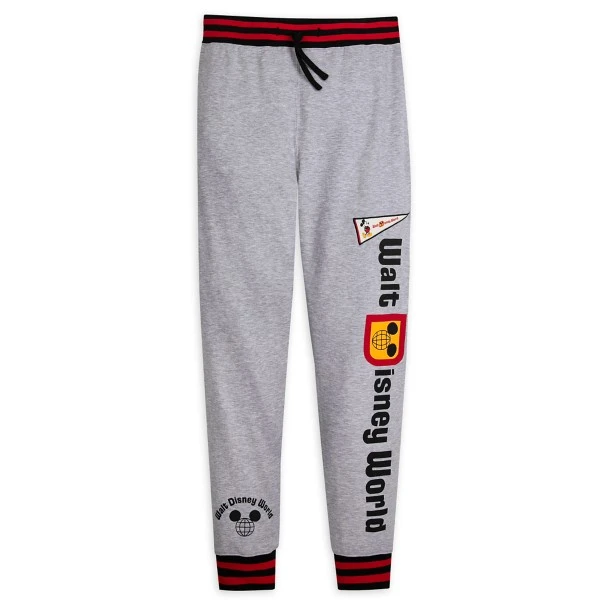 Fans of Walt Disney World will give a cheer on cool nights at Disney’s vacation kingdom in these sporty heathered jogger pants with vintage pennant screen art, resort logos, and striped ribbed trims.